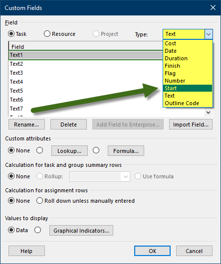 In the Custom Fields dialog box, in the upper right corner, select the Type dropdown and select the appropriate field type. It is best to select a type that fits the purpose and characteristics of the data being stored. If you were to store a date, the “Start”, “Finish”, and “Date” fields are good candidates. If the date pertains to a start date, “Start” is a better choice than “Date” because it more accurately reflects the underlying purpose of the date. If you were storing someone’s birthday, then “Date” would be a better choice. In this example, “Start” would be a good choice for storing the start date of an event. The same would be said for storing finish date information in the “Finish” field type.