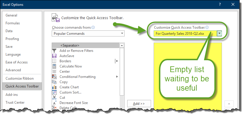 Despite the convenience of having your most often used controls a mere click away, there is one small drawback. Imagine a feature you use extensively in a single document, but hardly ever use when that document of closed. That document-centric button occupies space in the QAT that could otherwise be used for another button, or removed entirely to de-clutter the toolbar.