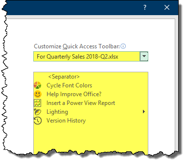 Any program feature placed in this list will appear in the QAT when the file is open and will be automatically removed when the file is closed.