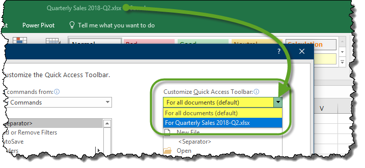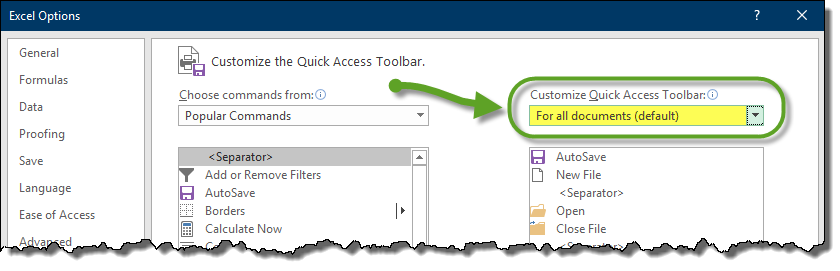 A feature in the customization area that most users never notice is the fact that you can add a program feature to the QAT that appears and disappears based on the opening and closing of a specific document. Below is a sample of the QAT customization dialog box. Notice the setting for Customize Quick Access Toolbar is set to a “global mode” so that all modifications are applied to the program and not any specific document.