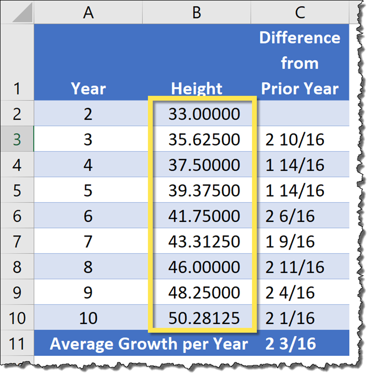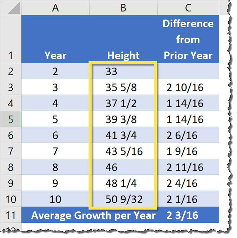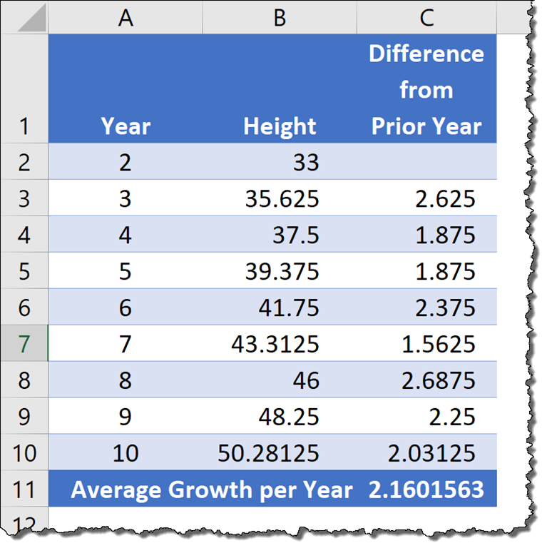 Now you are in a position to run calculations against the data (i.e. Average height grown per year equals 2.16”.)